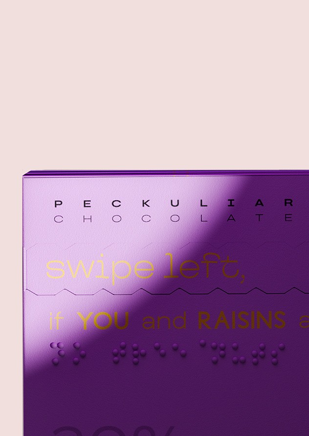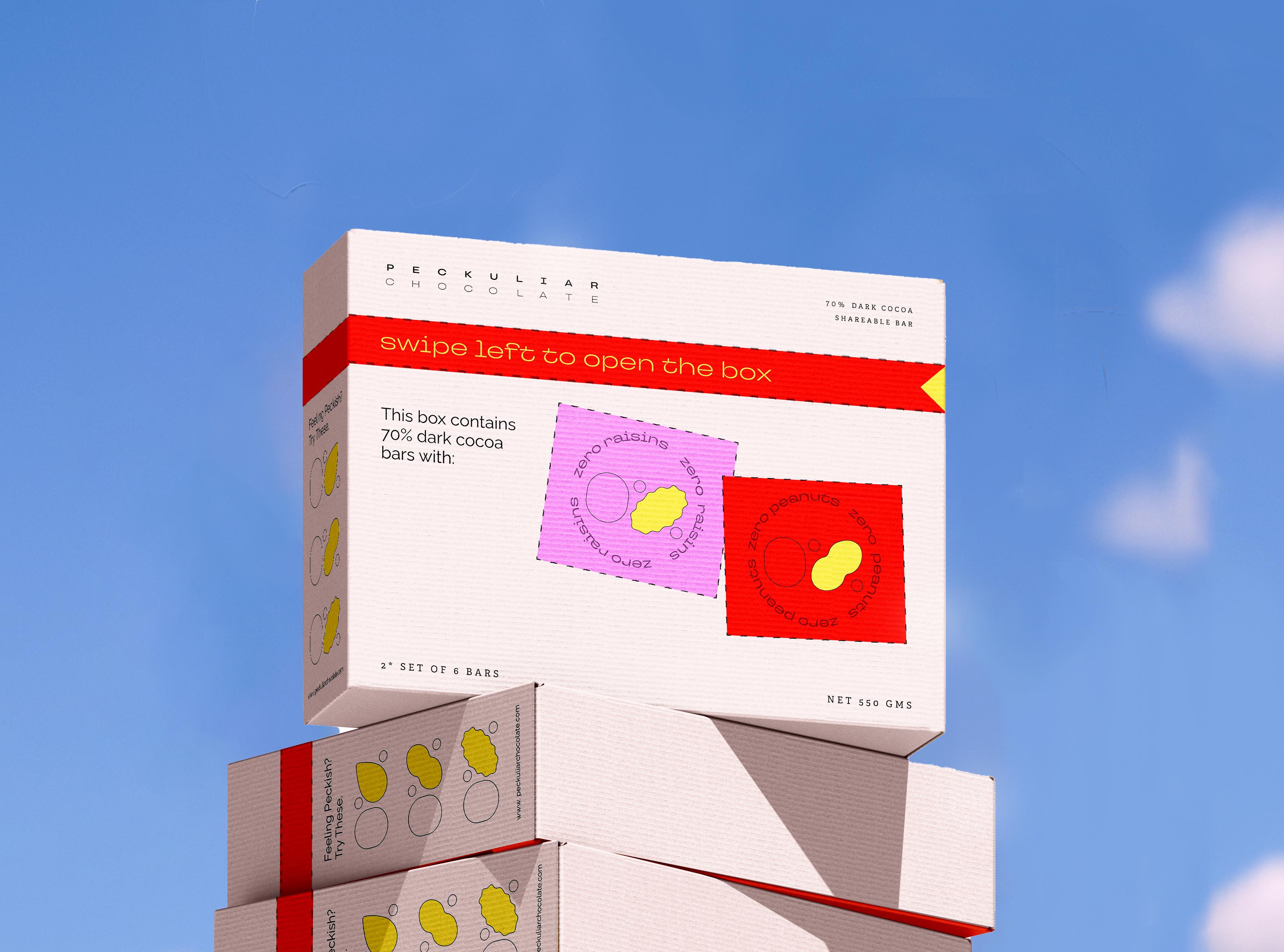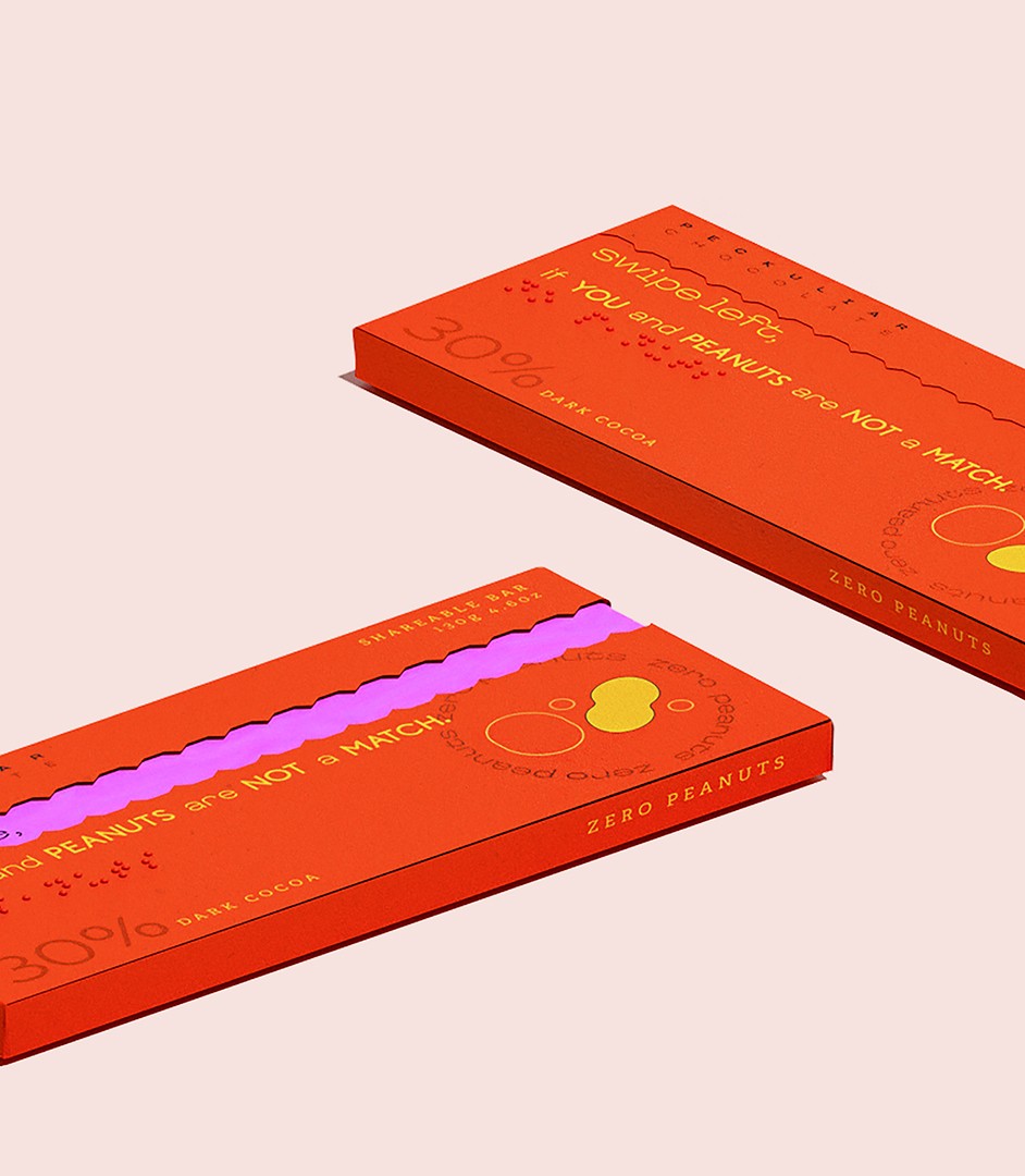 lengthy lists of ingredients. For individuals with allergies and peculiar tastes, Peckuliar Chocolate redefines the snack sharing experience with a dynamic, interactive, and functional packaging design system.