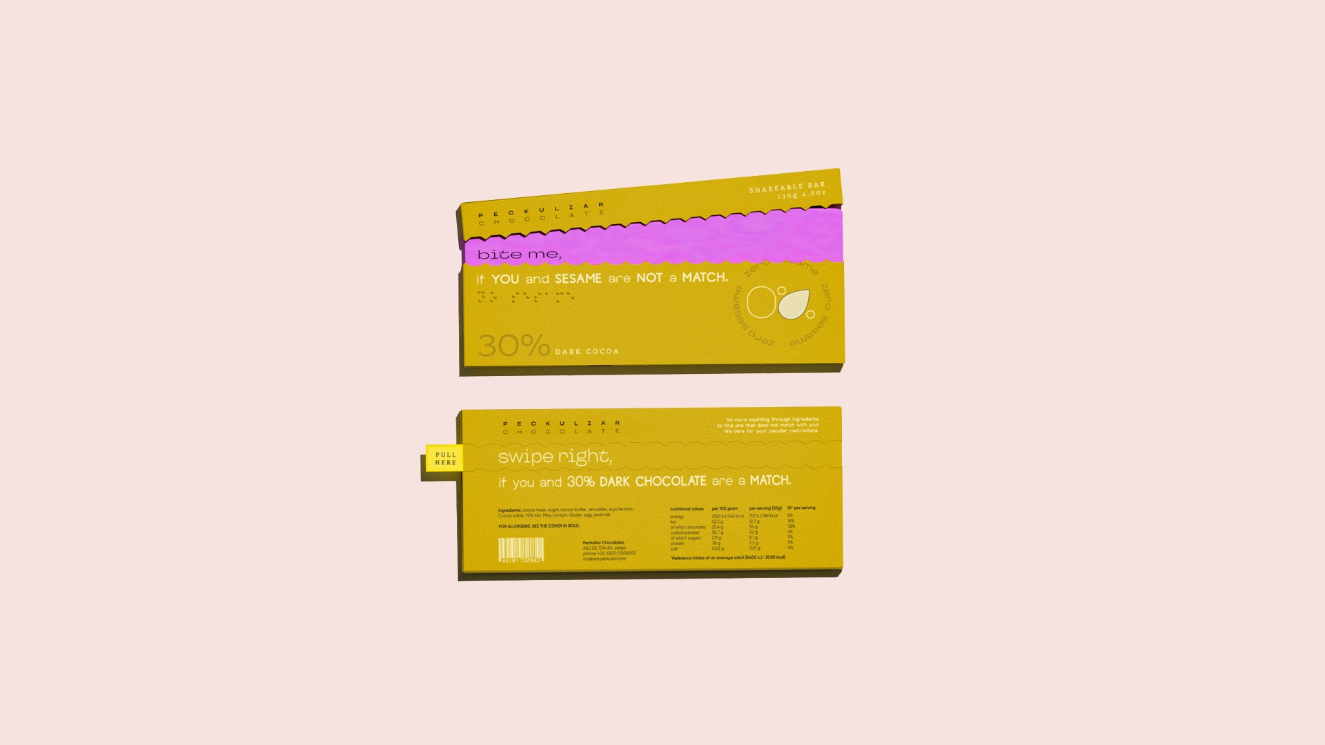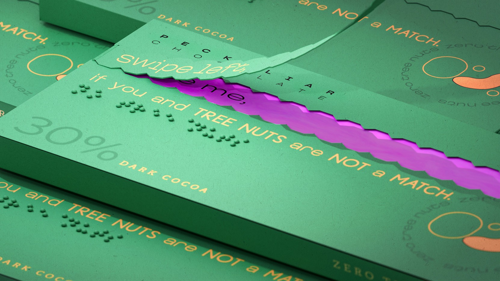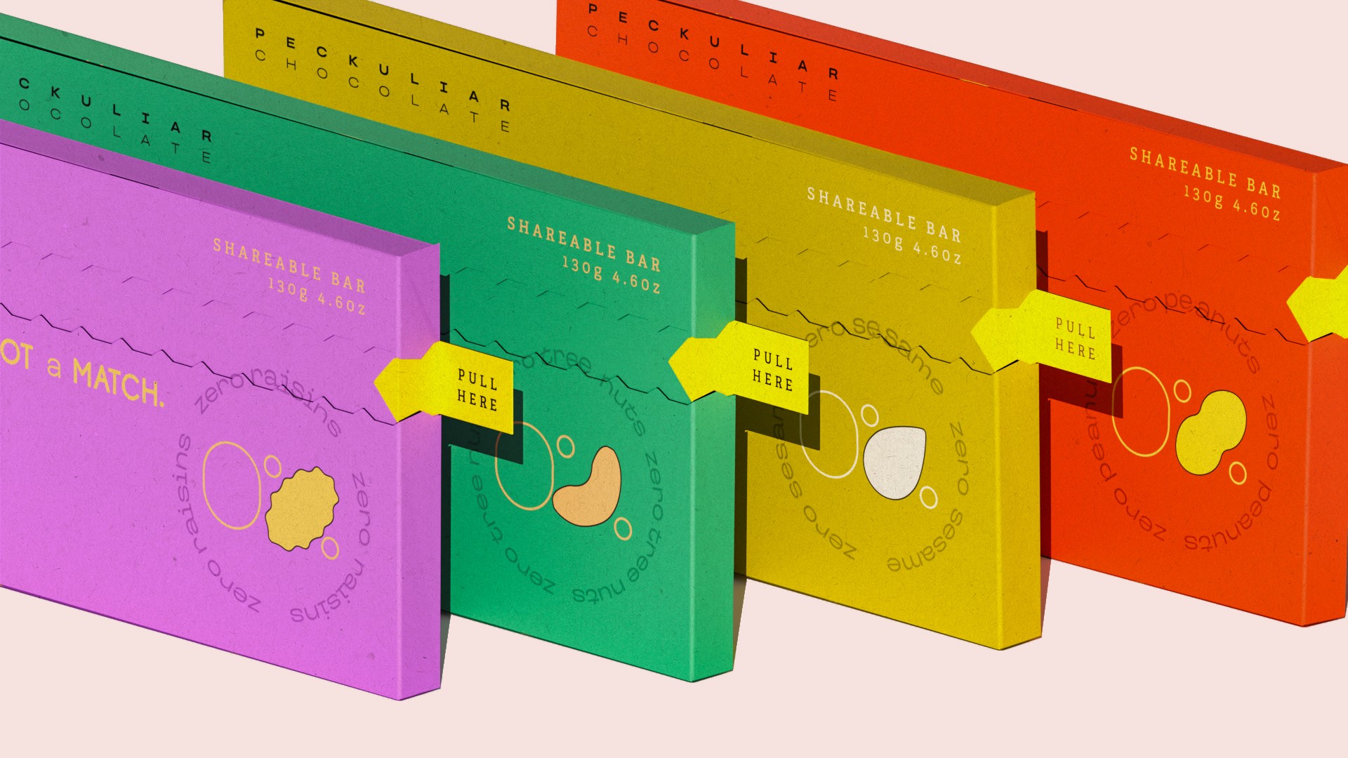 lengthy lists of ingredients. For individuals with allergies and peculiar tastes, Peckuliar Chocolate redefines the snack sharing experience with a dynamic, interactive, and functional packaging design system.